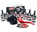 - Includes 5 quarts of 20W50 Motorcycle Oil, 1 quart of V-Twin Transmission Oil with ShockProof, 1 quart of Primary Chain Case Oil, 1 bottle of Fuel Injection Cleaner for Powersports, a sticker kit, a Red Line Oil embroidered hat and a versatile funnel